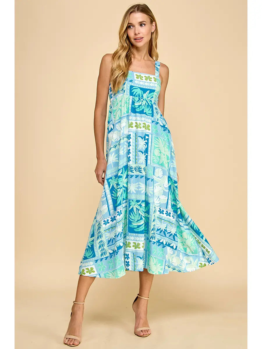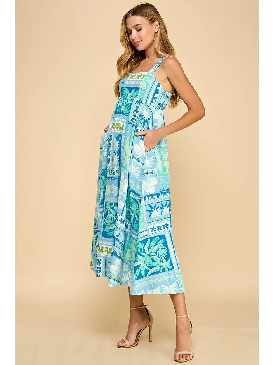 Abstract print midi dress featuring a square neckline, wide straps, side pockets, and a smocked back.