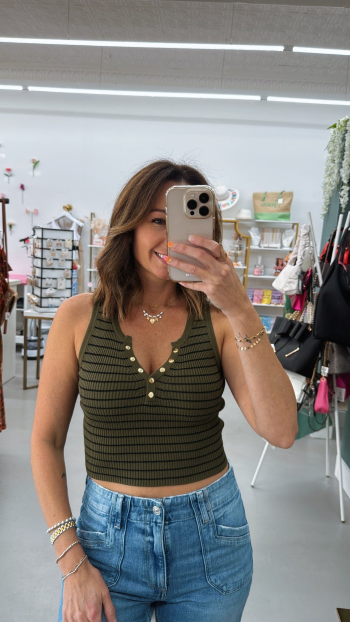 This sleeveless crop top features a fun split neckline and secure snap buttons for easy wear. Made from a ribbed fabric, it offers a comfy stretch with a trendy stripe print that adds a pop of style. Perfect for sunny days or layering up with your favorite jacket, this top is sure to brighten your casual wardrobe with a playful vibe.