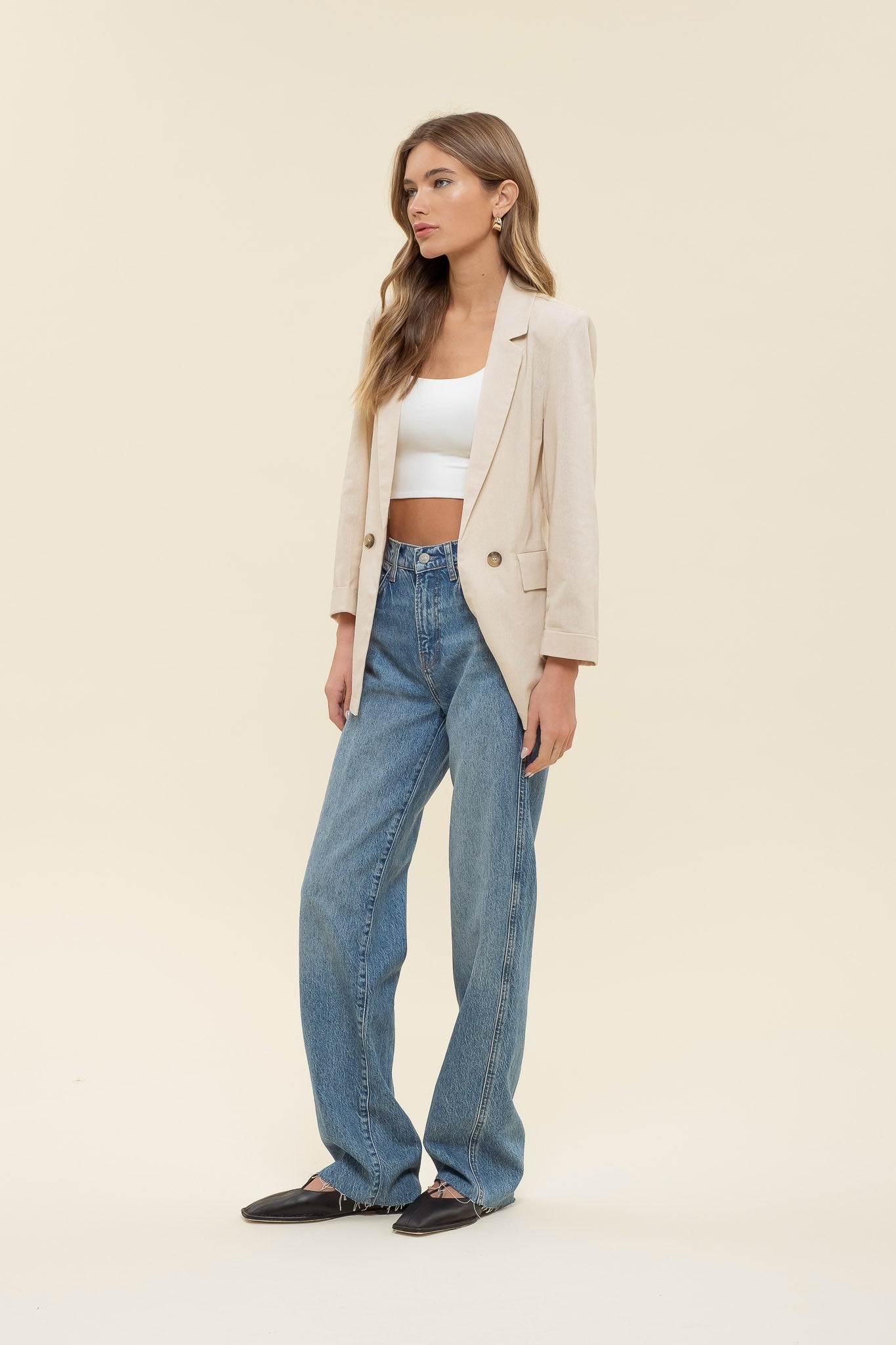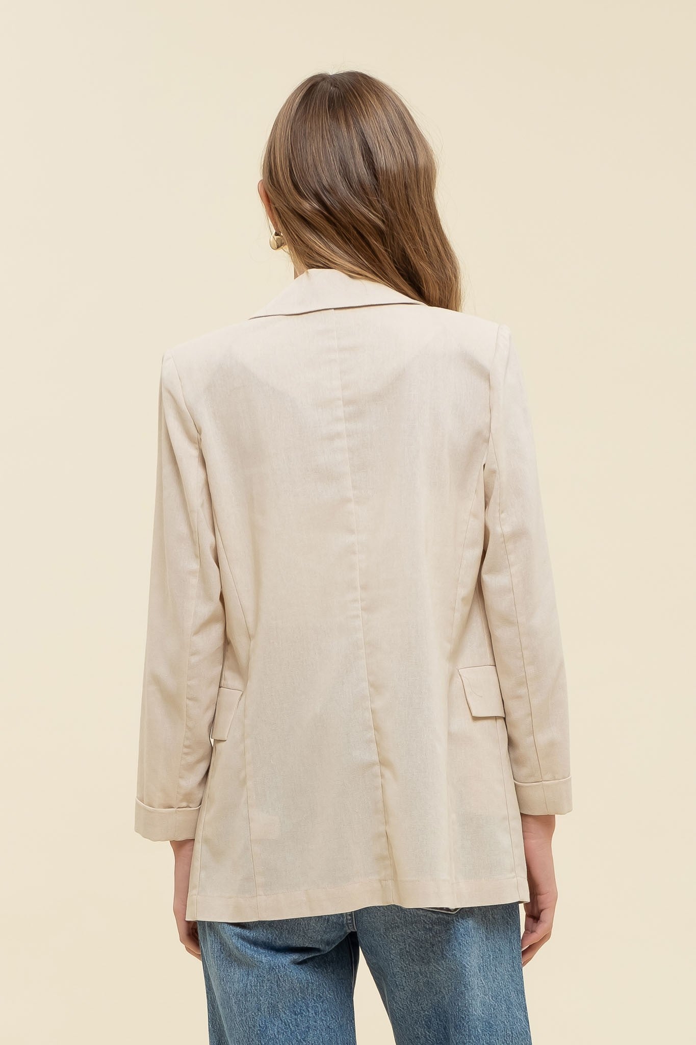 This cool solid blazer brings style and a dash of fun to your wardrobe! Featuring a notch collar, 3/4 sleeves with long cuffs, and subtle shoulder pads, it shapes your silhouette perfectly. The long-line cut adds a trendy touch, while pocket tabs and button-front details keep it effortlessly chic. Lightweight and unlined, it’s the perfect playful layer for any season.