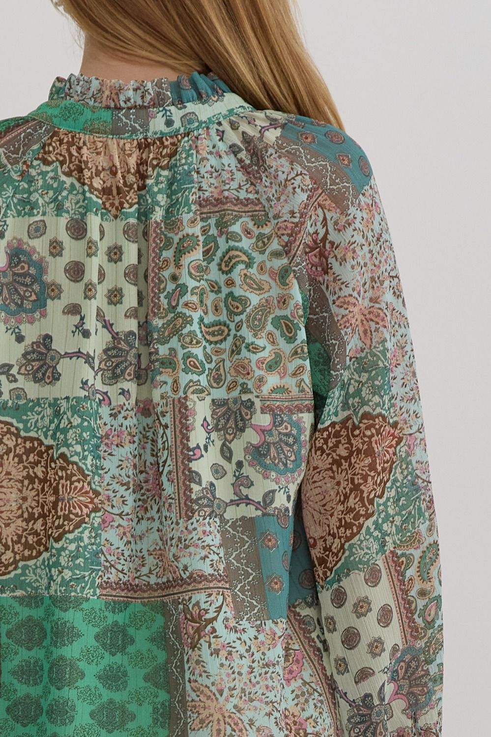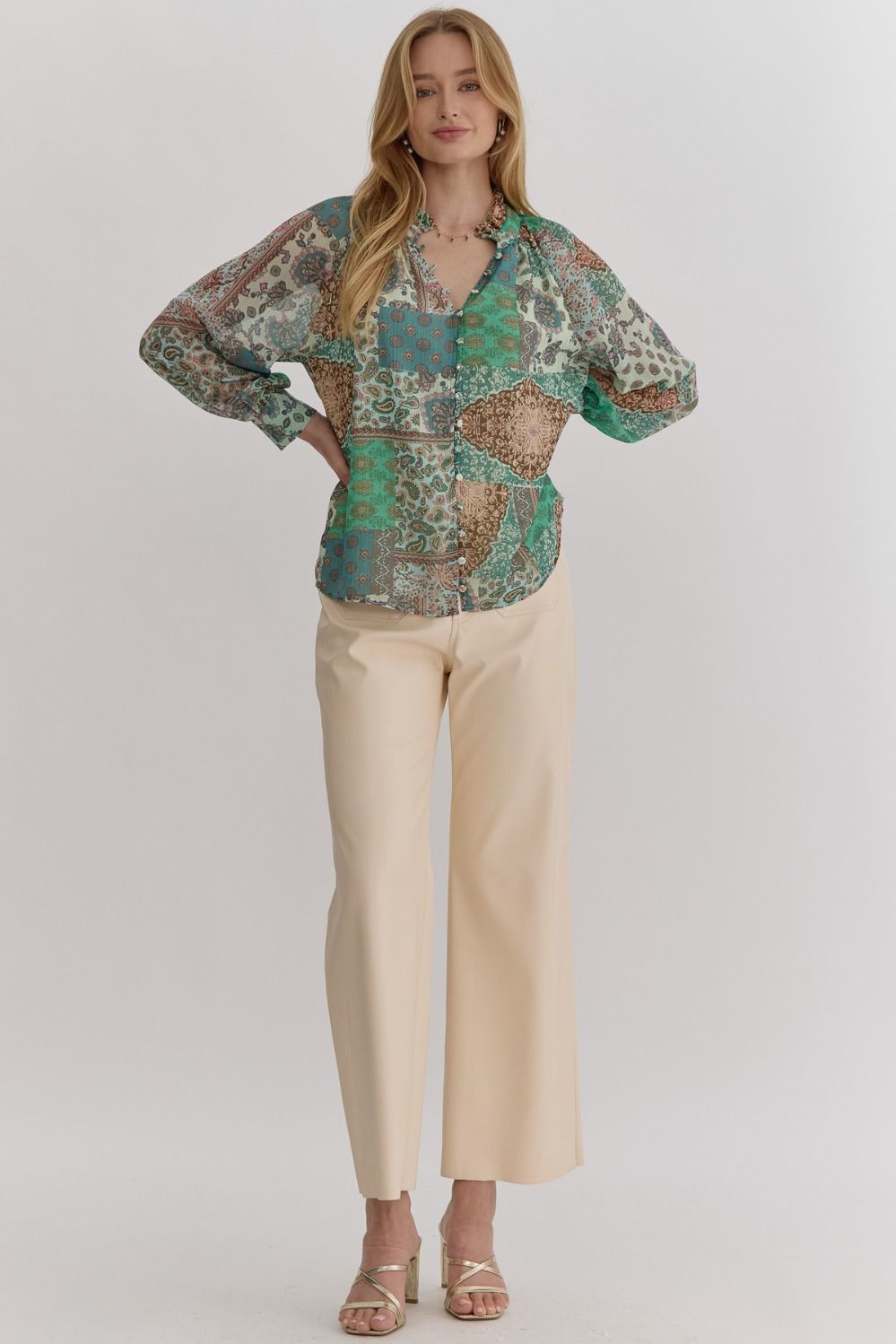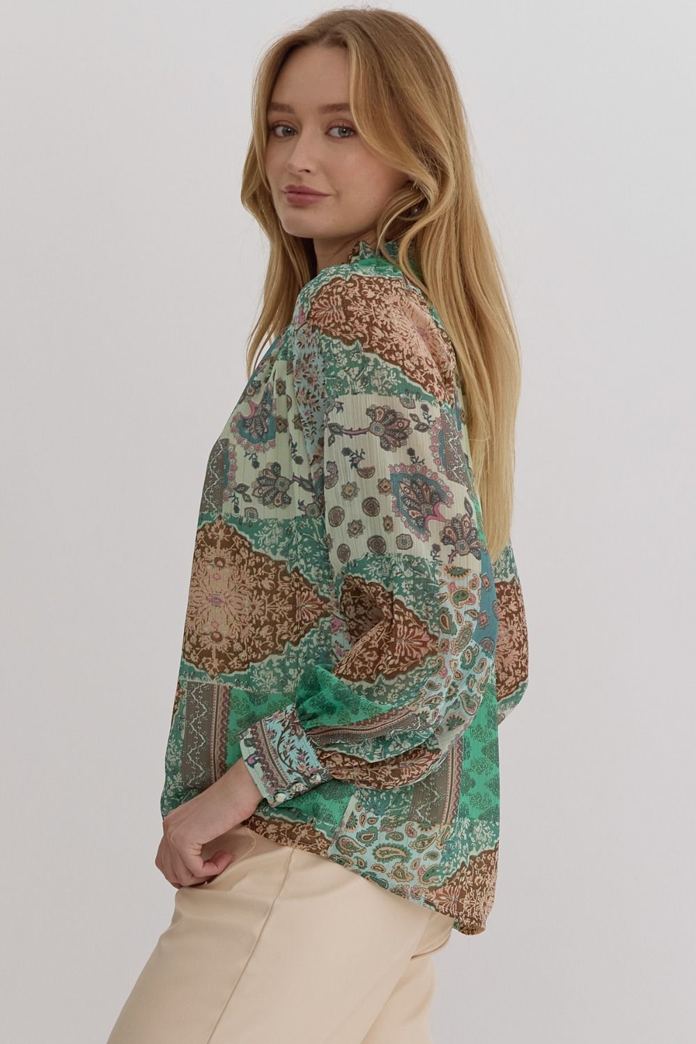 Paisley print long sleeve button up top featuring ruffled neckline. Lined. Woven. Non-sheer. Lightweight.