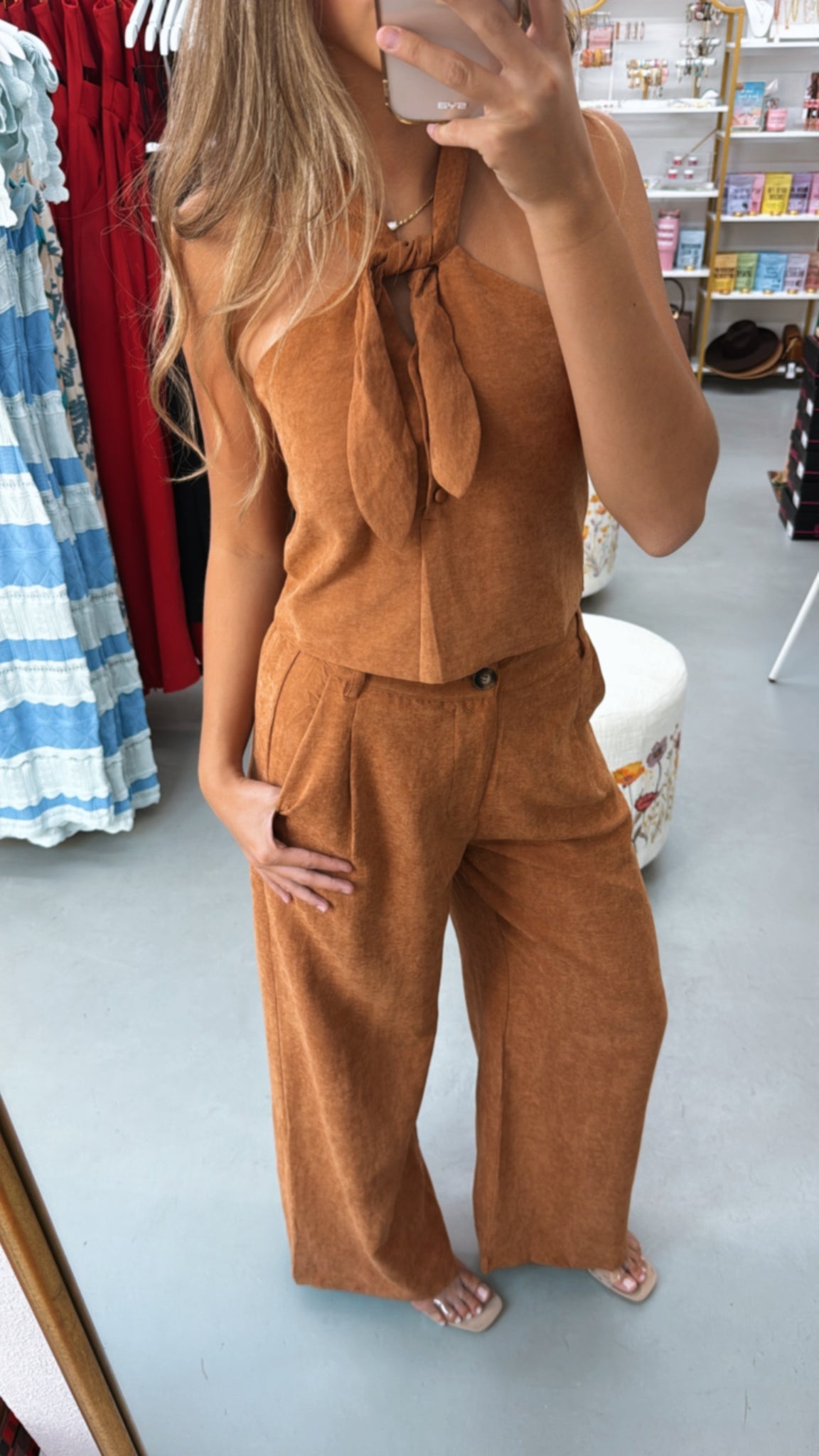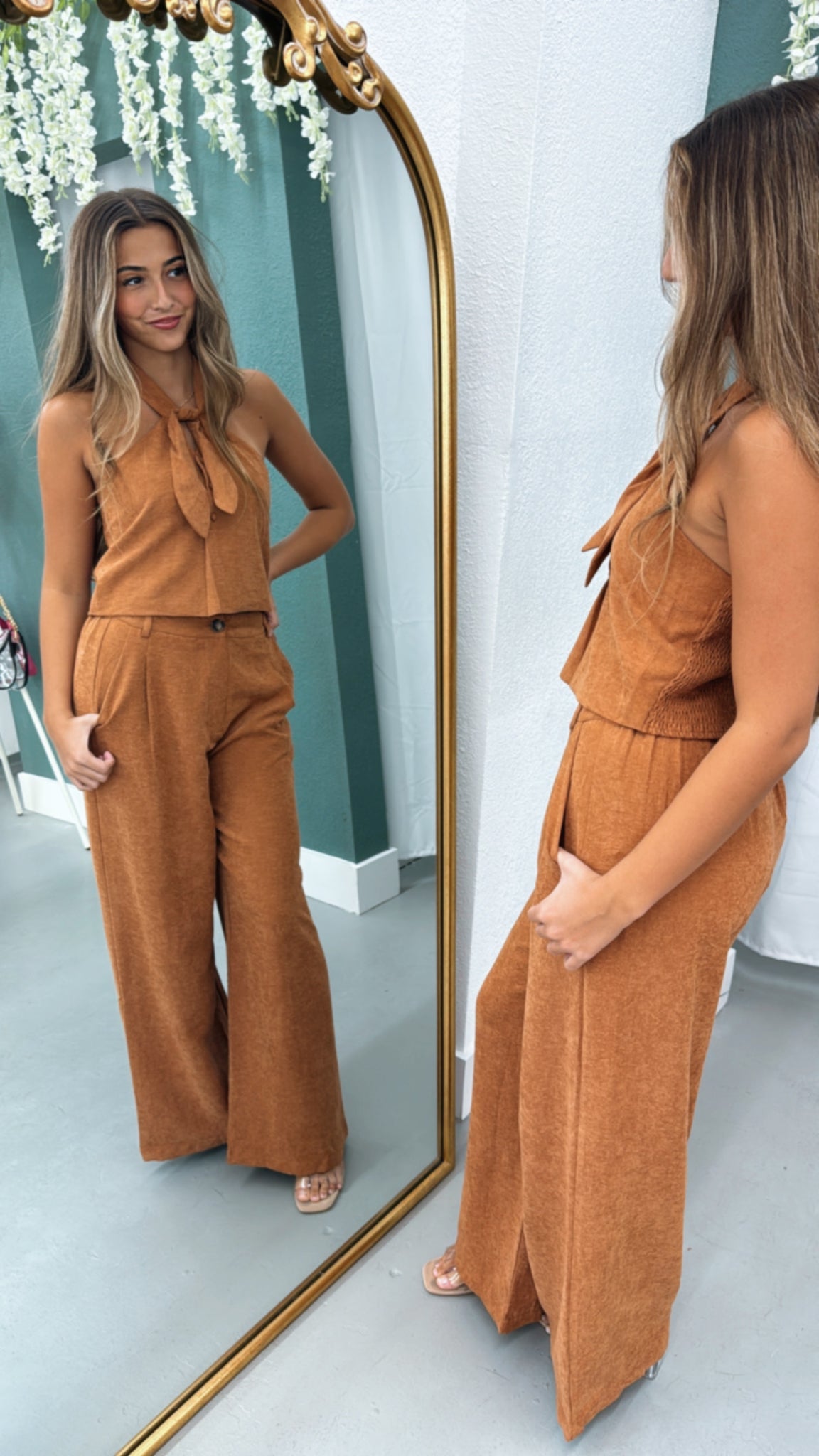 Channel effortless charm in the Sundown Halter Neck Top. This playful piece features a rusty brown hue, a flattering halter neck with a tie top, and a button-down front. The smock back adds a comfy, flexible fit, while the soft material keeps you feeling cozy all day. Perfect for sunny days and casual outings! Pair it with the matching pants for a completed look!