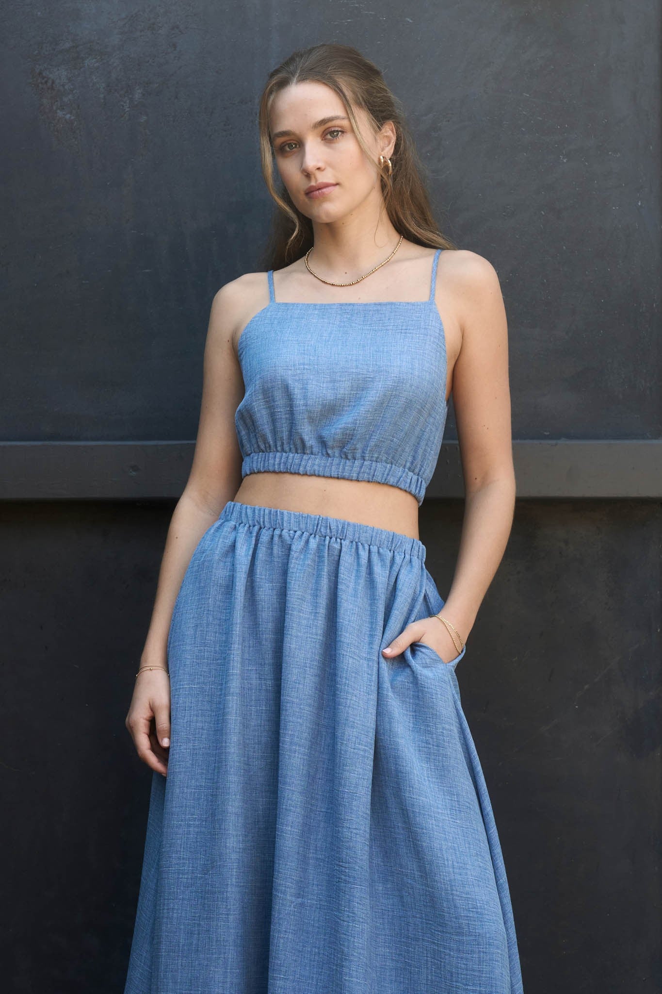 Upgrade your beach look with the Beachin' Crop Top Blue. Made with a square neck, sleeveless design and an elastic waist, this solid, woven top is both stylish and comfortable. Perfect for those hot summer days, stay cool and trendy with this lined crop top.