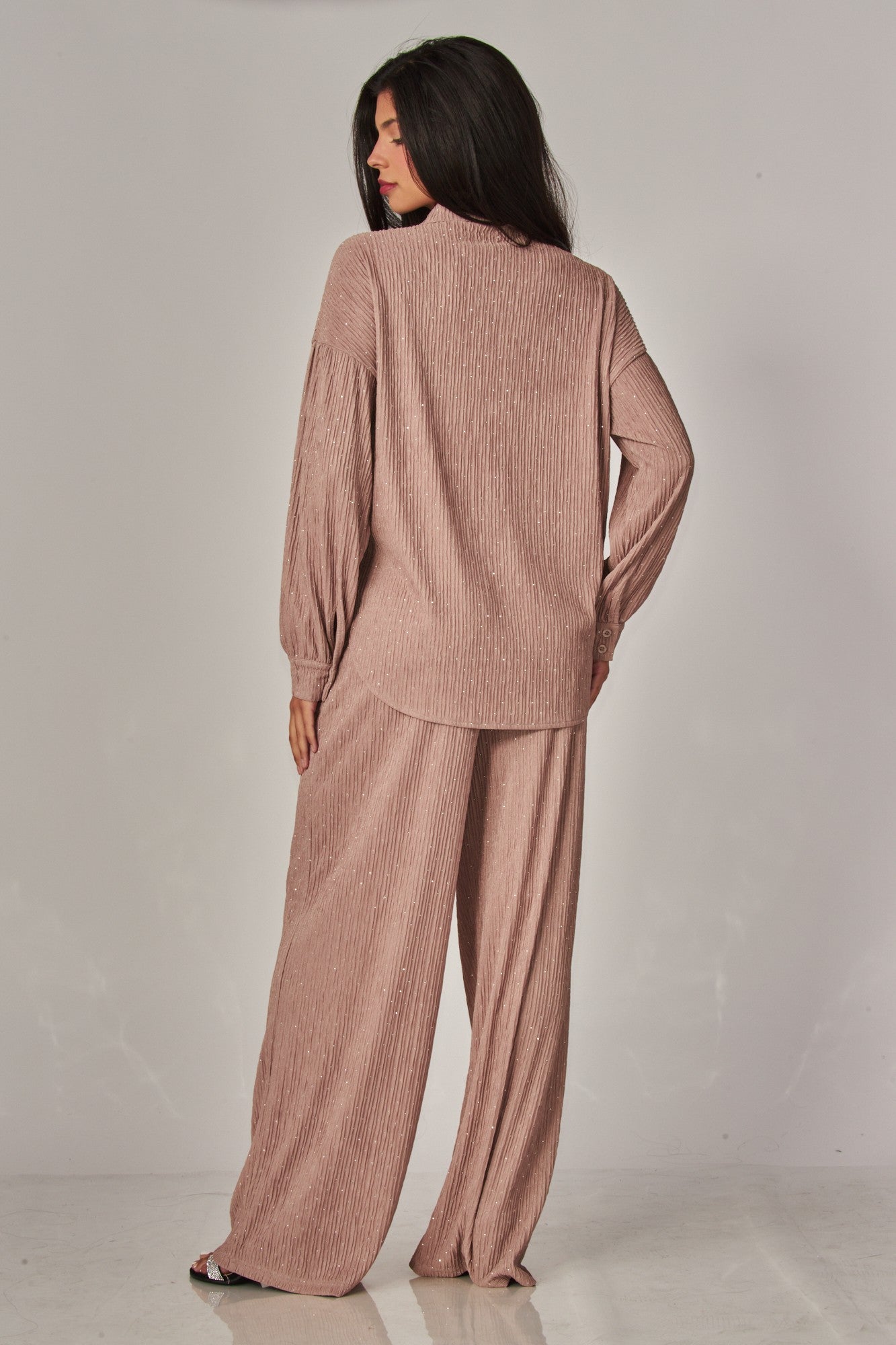 This ensemble invites you to indulge in the luxurious feel of finely pleated plisse fabric, designed to capture the essence of sophisticated leisure. The blouse drapes beautifully over the frame, complementing the graceful flow of the wide-leg pants. This set promises a look that's as captivating as it is comfortable. It's an outfit that doesn't just make an entrance-it creates an unforgettable atmosphere.