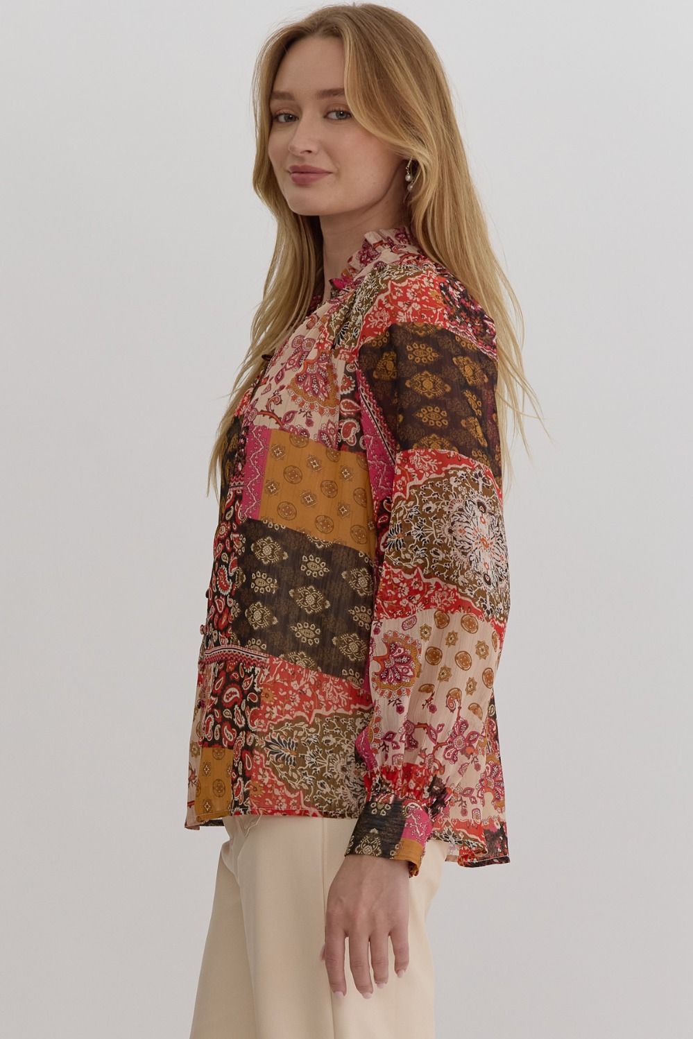Paisley print long sleeve button up top featuring ruffled neckline. Lined. Woven. Non-sheer. Lightweight.