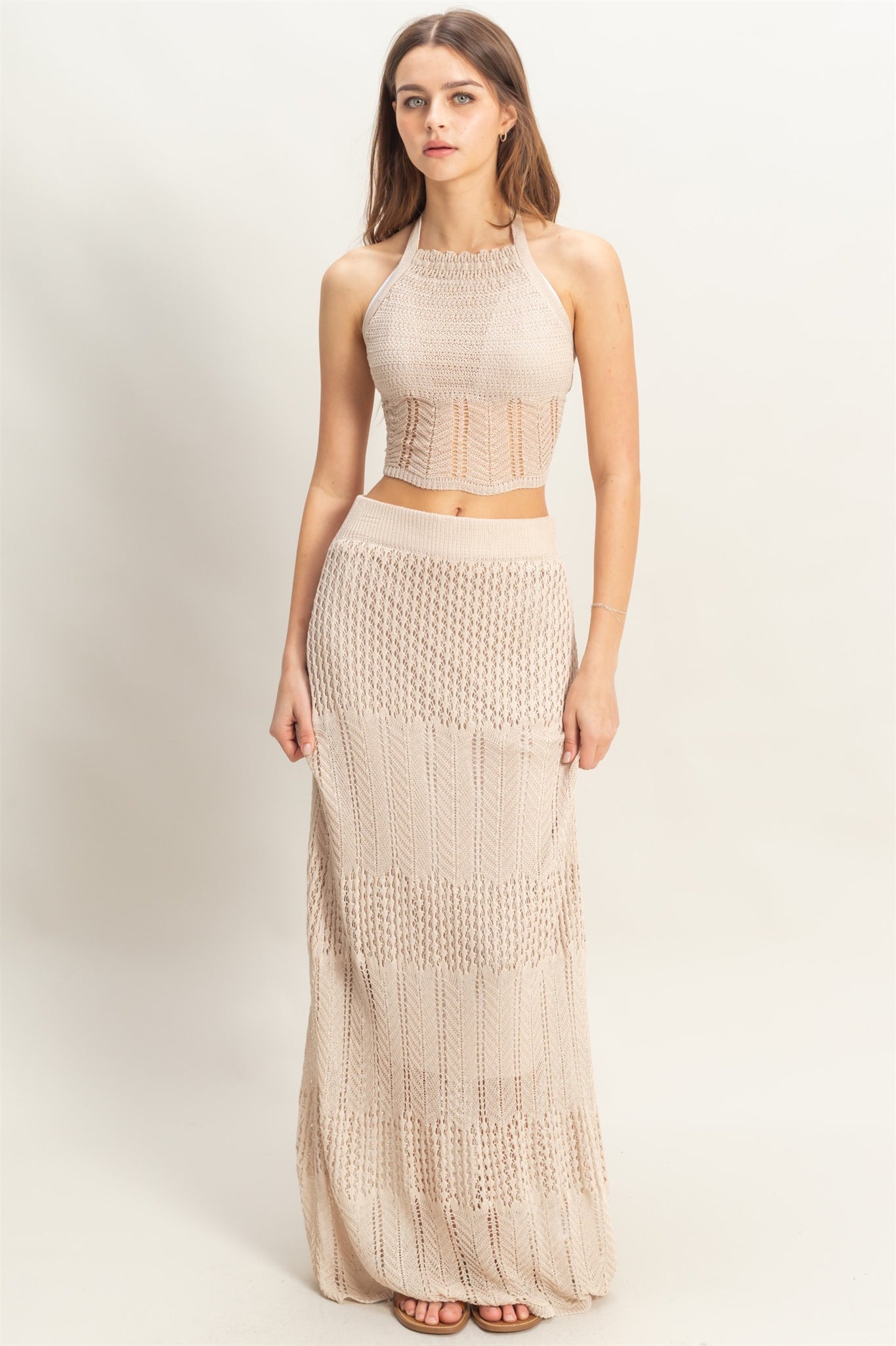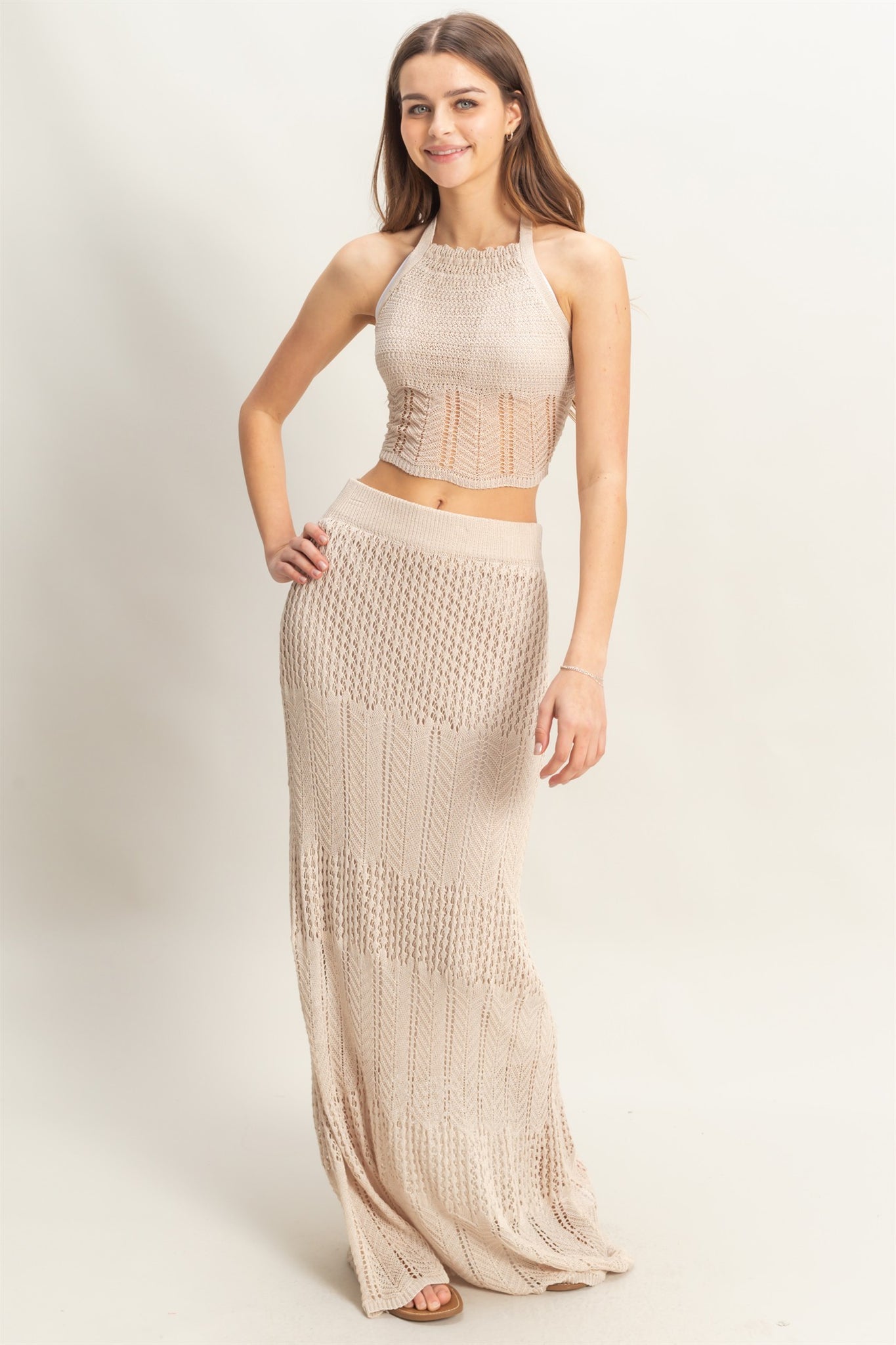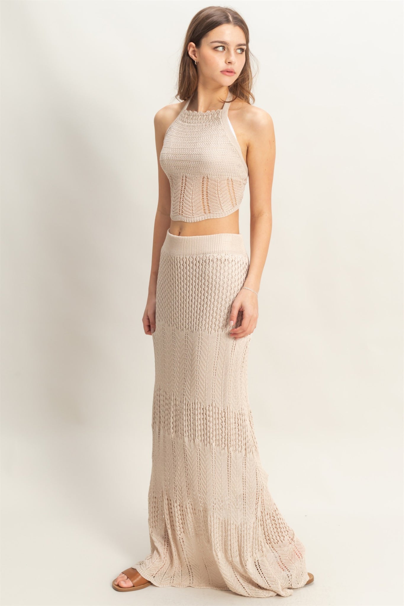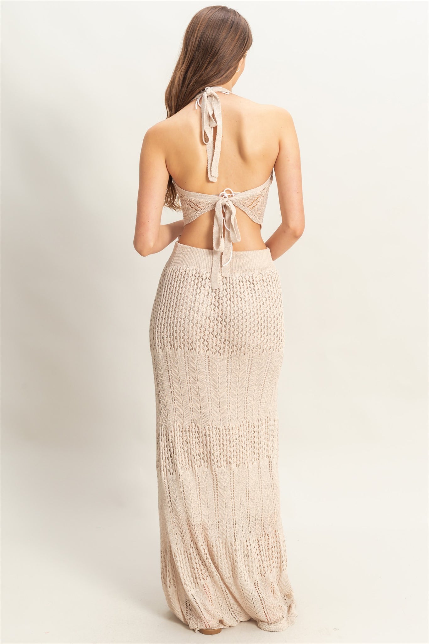 Step into the spotlight with the Arabian Nights Set in Khaki. This playful knit ensemble features a halter neckline and sleeveless bodice that flatters your silhouette. The curve-hugging maxi skirt adds a touch of elegance, while the backless design with a self-tie strap brings a flirty finish. Perfect for feeling extra special wherever you go!