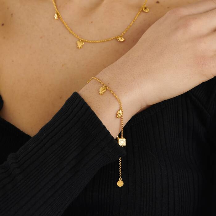 Elevate your jewelry offering this season with our Boheme Waterproof Gold Charm Bracelet. Designed in durable 18K Gold PVD Coating, this necklace is waterproof, sweat proof and life proof - and features five golden charms. You can pair this with the matching Boheme Necklace for a coordinated look.