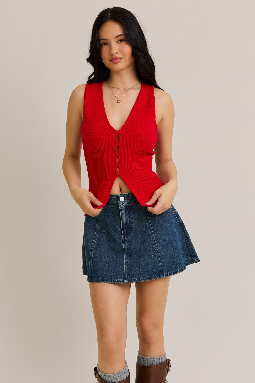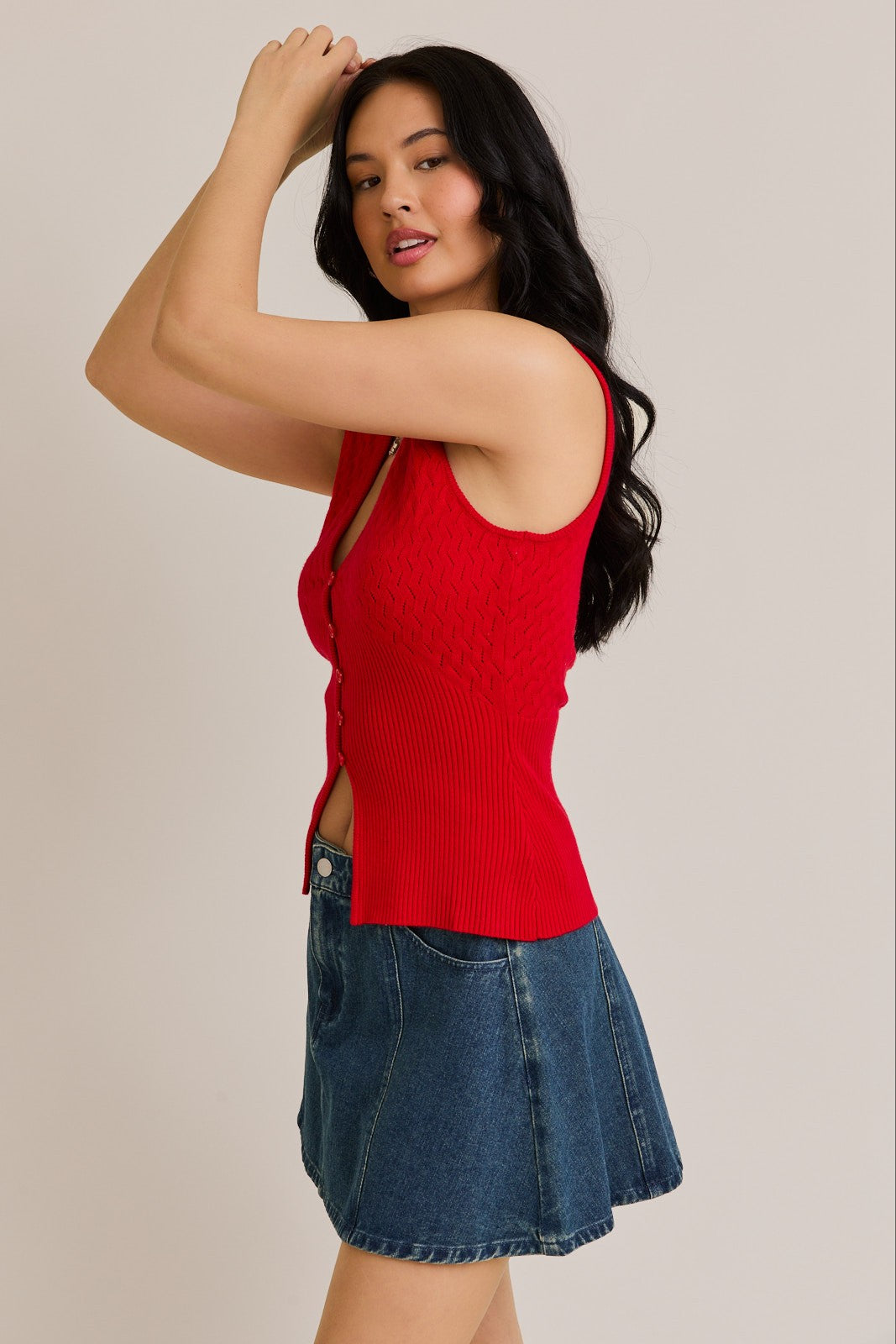 This stretchy knit sweater top is your new BFF for all-season style! Featuring a flirty V-neck and sleeveless design, the Cover Me buttons down for versatile wear. It comes in a bold red and a delicate cream color. And the comfy fabric hugs you in all the right places. Dress it up or keep it casual - this top's ready for whatever your day throws at you!