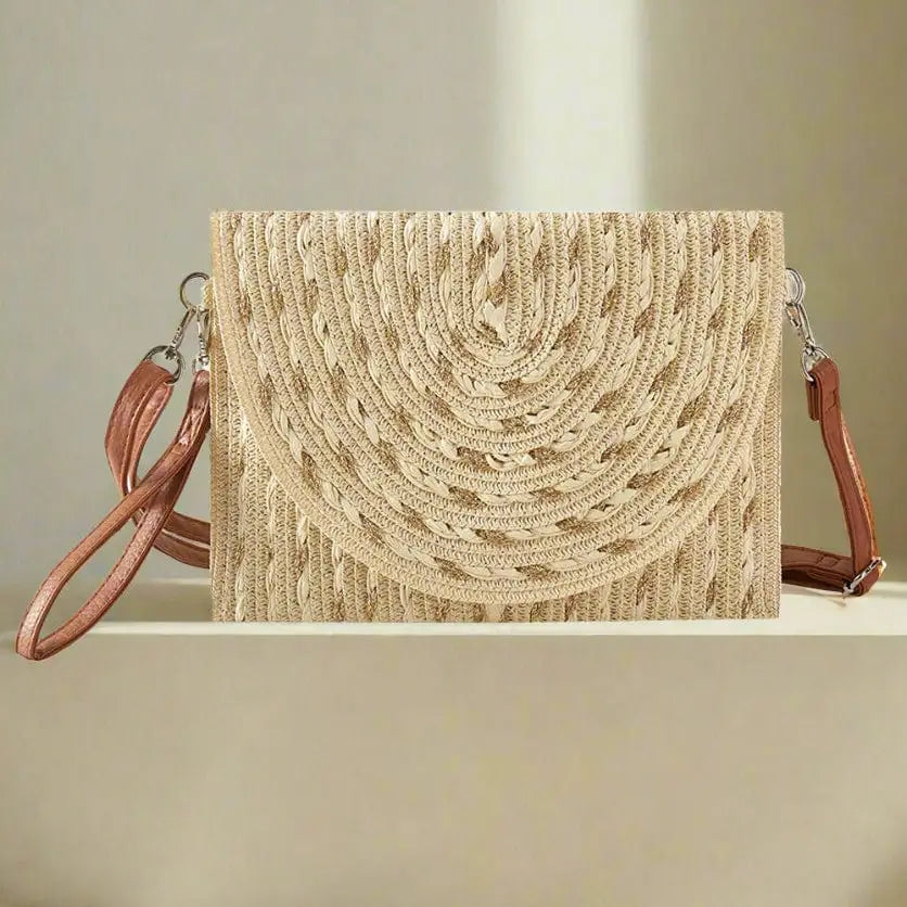 This versatile bag features a unique mix of gold threads and colorful straw, giving it a modern and stylish look. With its compact size and dual functionality as a clutch or crossbody bag, it is perfect for any occasion. The perfect accessory for those who appreciate both fashion and functionality.