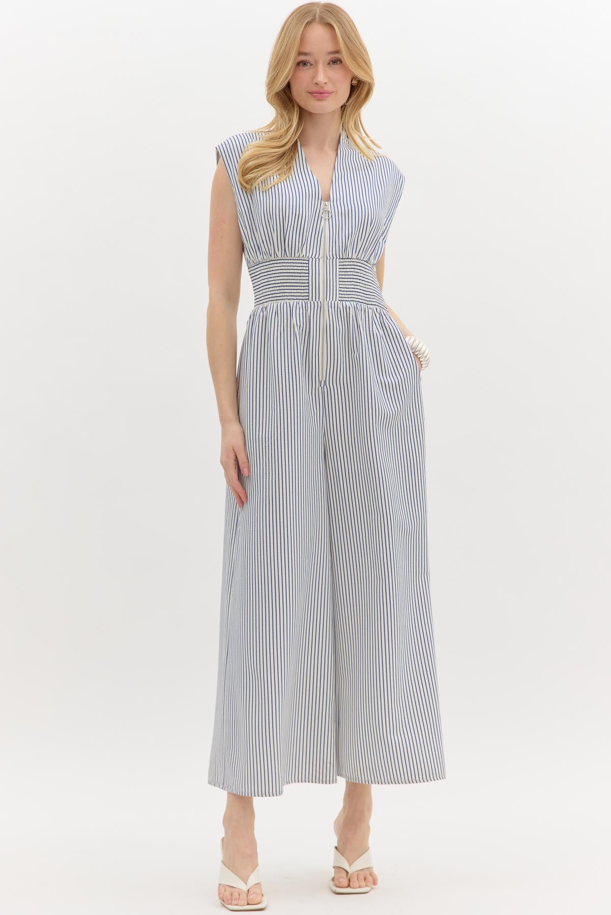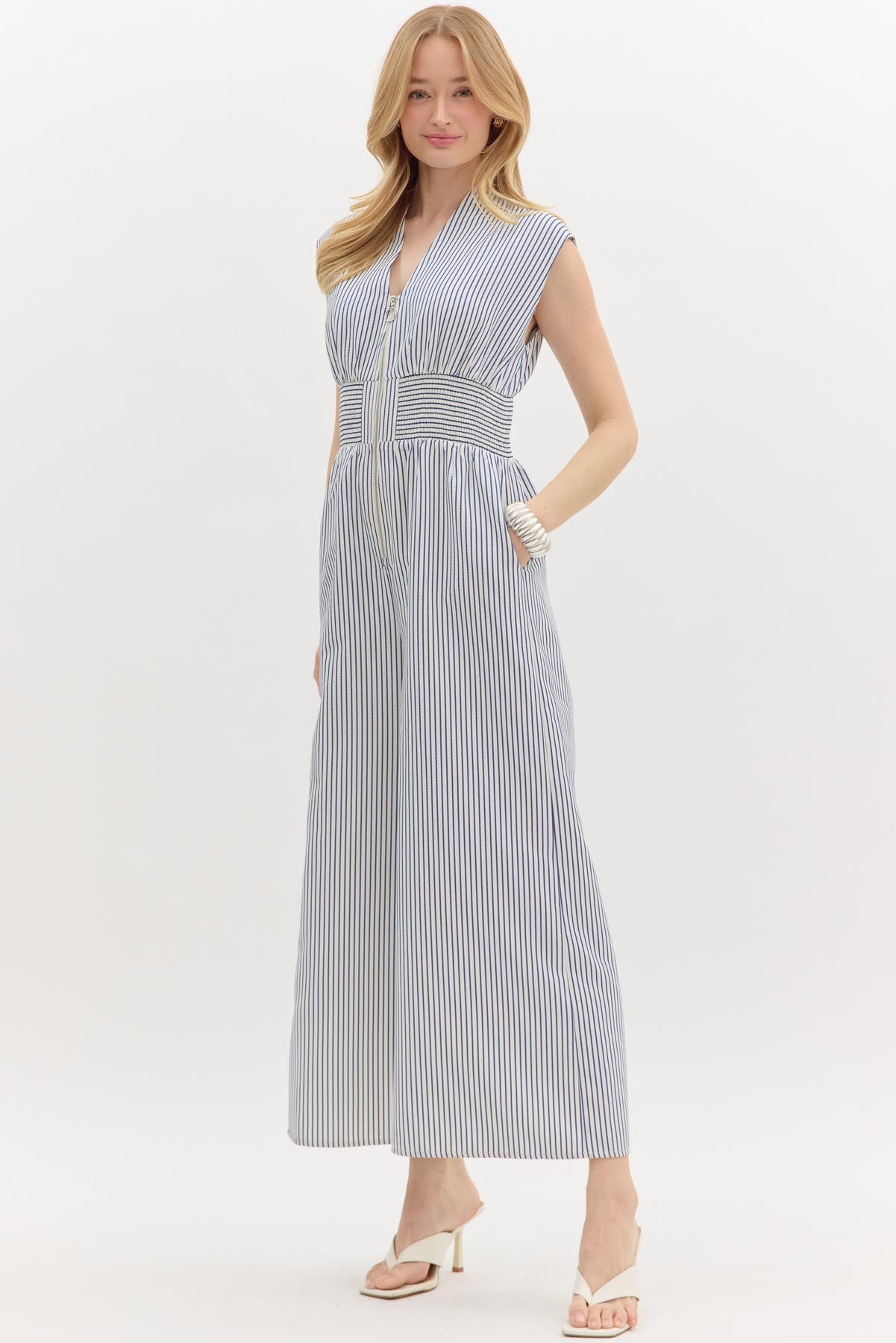 Effortlessly channel a nautical vibe with our sleeveless Nautical Lines Jumpsuit. The front zipper allows for easy wear, while the navy stripes add a touch of nautical charm. Perfect for any occasion, add this one-piece wonder to your wardrobe and set sail in style.
