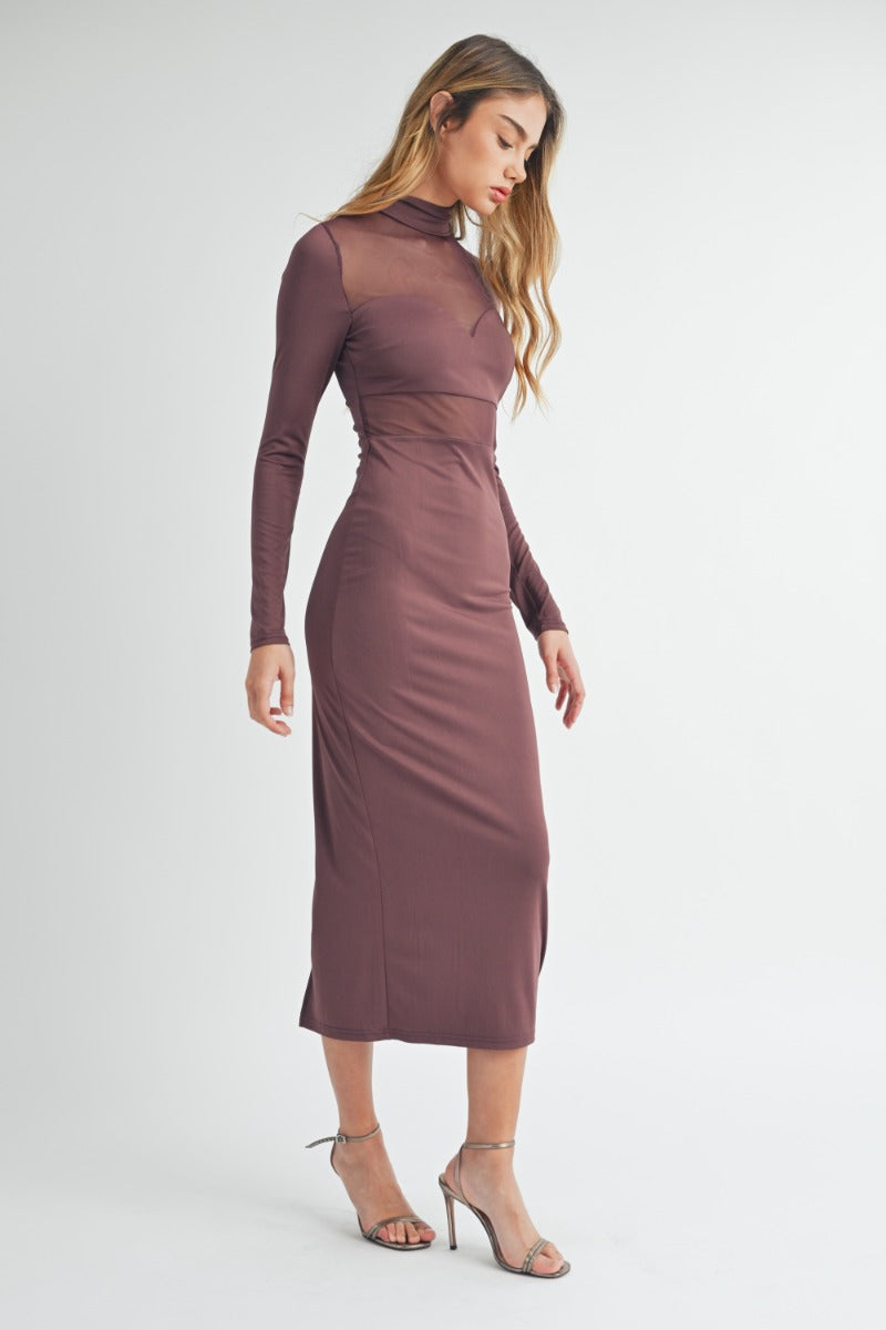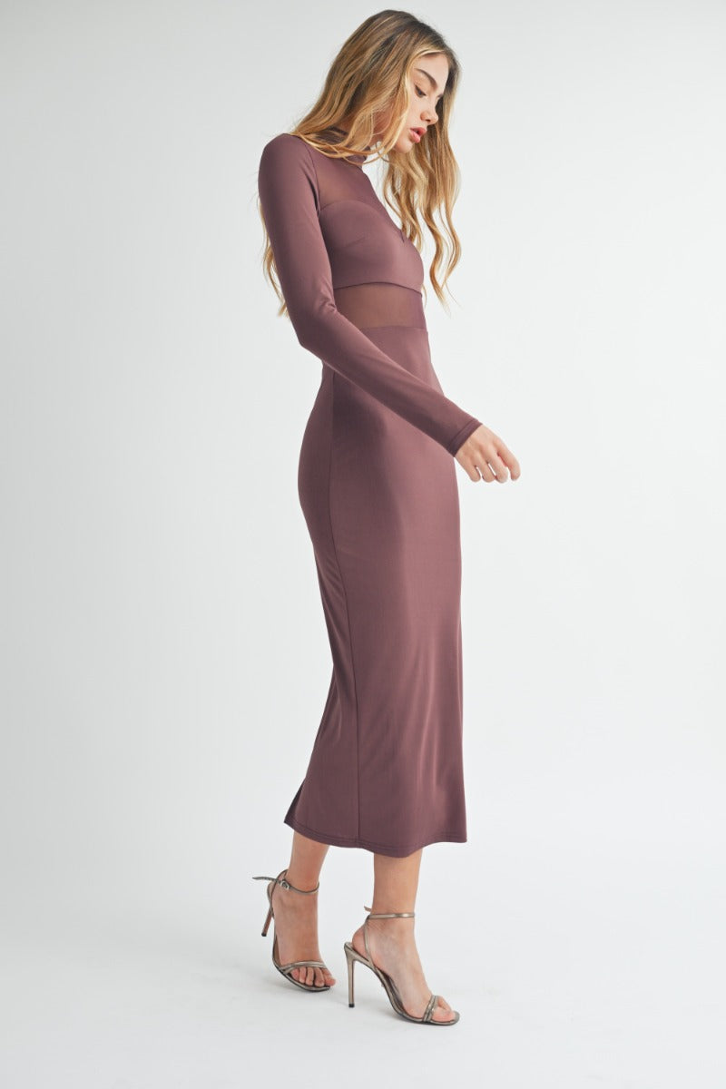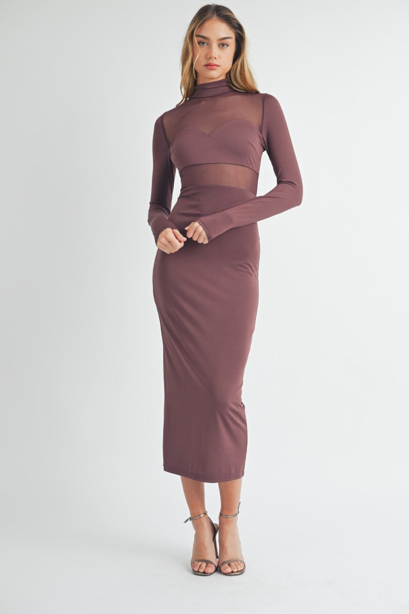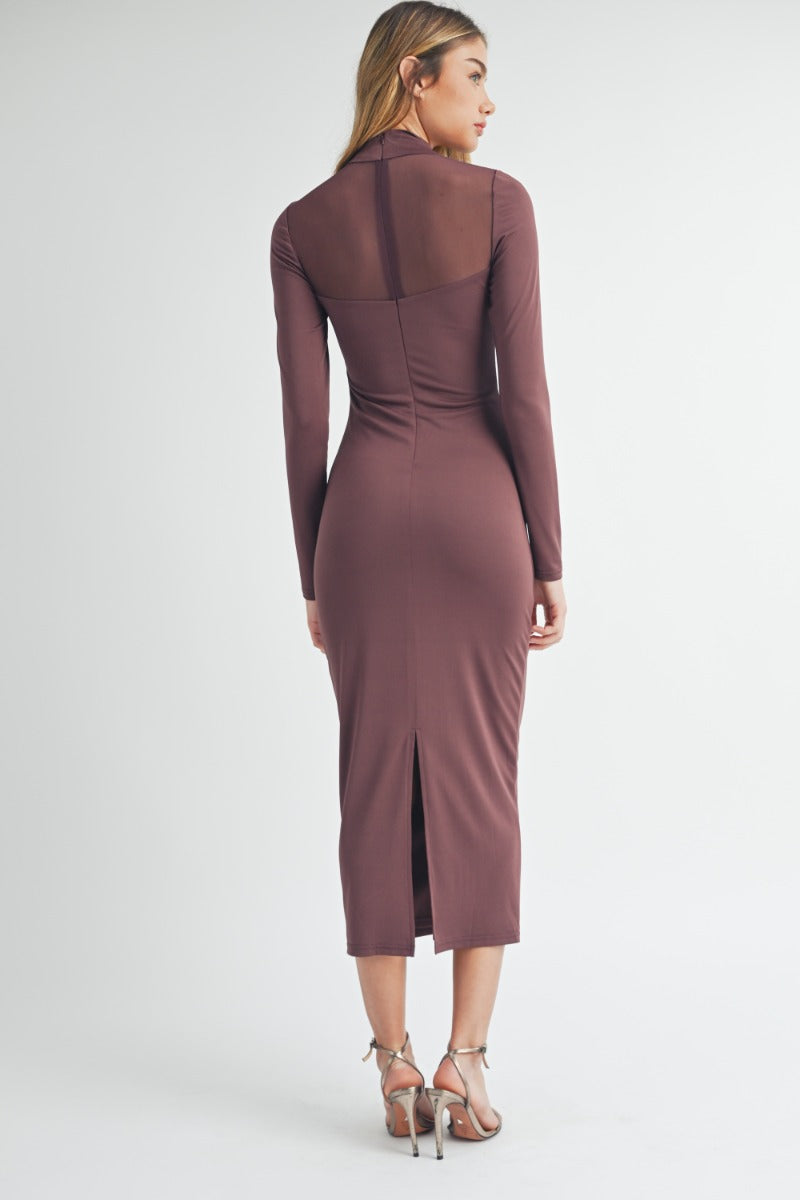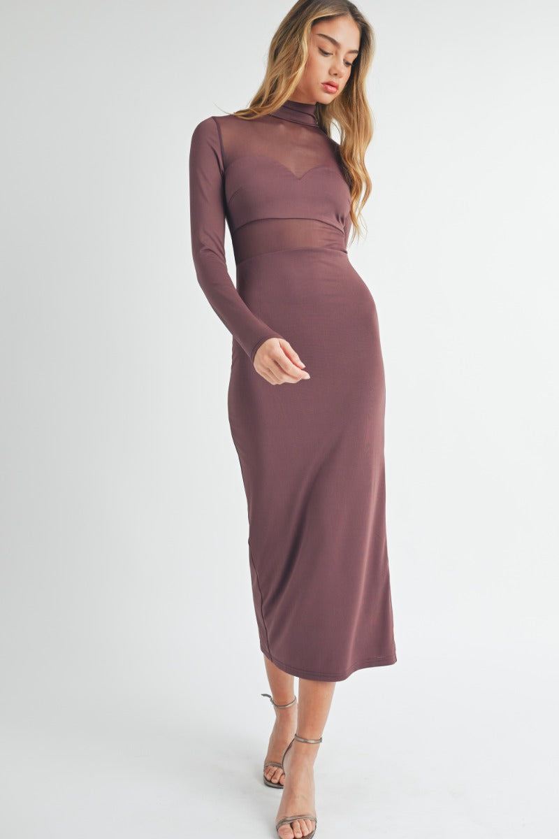 Step into style with the Plum-Tastic Mesh Bodice Midi Dress! This playful bodycon dress features a long-sleeve mesh bodice and a chic mock neck, perfectly blending flirtiness with sophistication. The invisible back zipper ensures a smooth fit, while the soft lining keeps you comfy all day or night. Ideal for turning heads at any event, this midi dress is your new go-to for effortless glam.