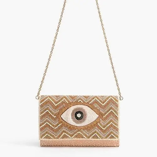Make a bold statement with this eye-catching clutch! This unique design features a rose gold wide evil eye beaded pattern that will have you standing out in any crowd.