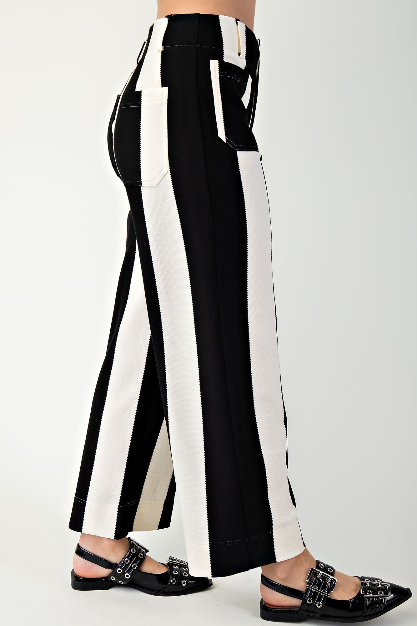 Effortlessly elevate your style with our Colette Cropped Wide-Leg Pants. Featuring a chic black and cream vertical stripe design, these pants are both soft and comfortable. Perfect for any occasion, you'll love the way they make you look and feel.