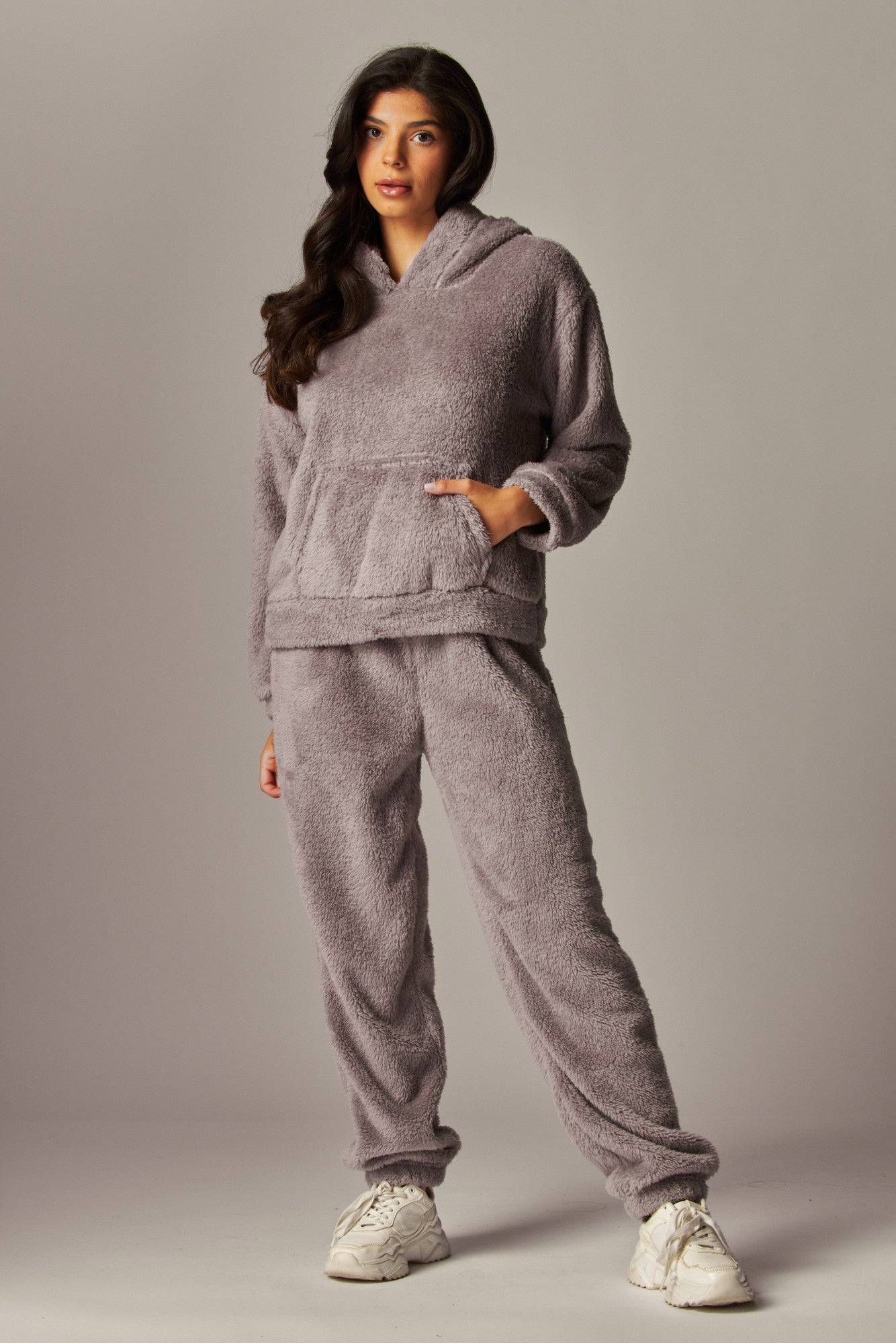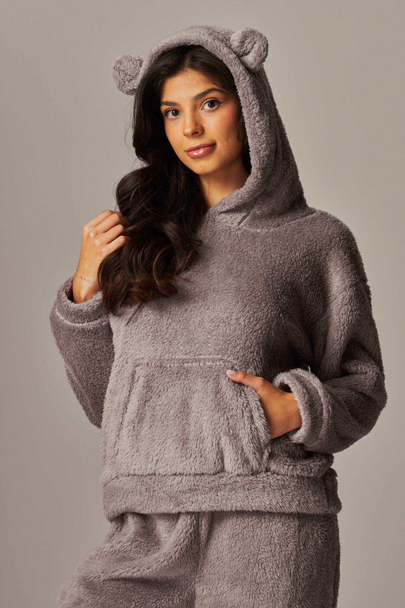 Stay cozy and stylish on the go with our set. This pajama set is made from incredibly soft brushed fleece, providing ultimate comfort. Featuring a relaxed, boyfriend fit with a drop sleeve, kangaroo pocket and a bear ear hoodie design. Complete ensemble by pairing it with pant for a head-to-toe look that exudes effortless style.